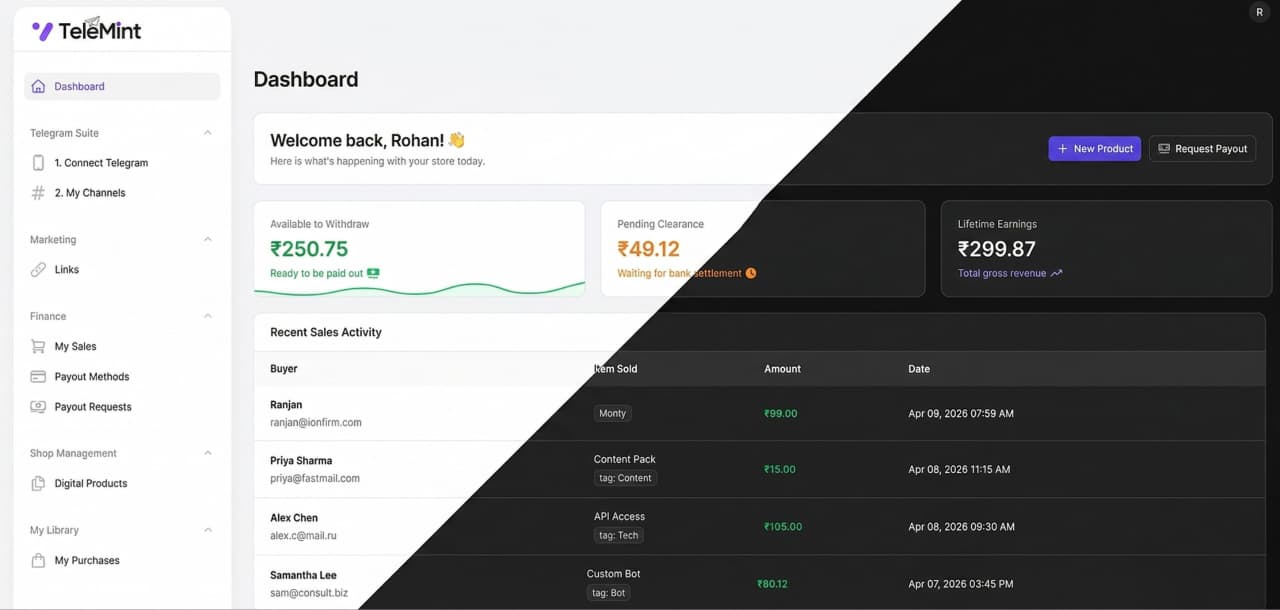 - Recent Transactions: A live feed of your latest sales, showing the buyer, product, and amount paid.